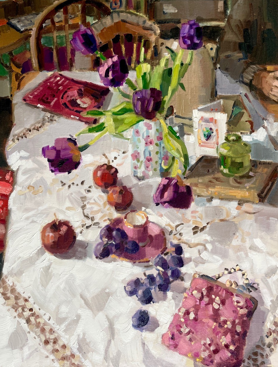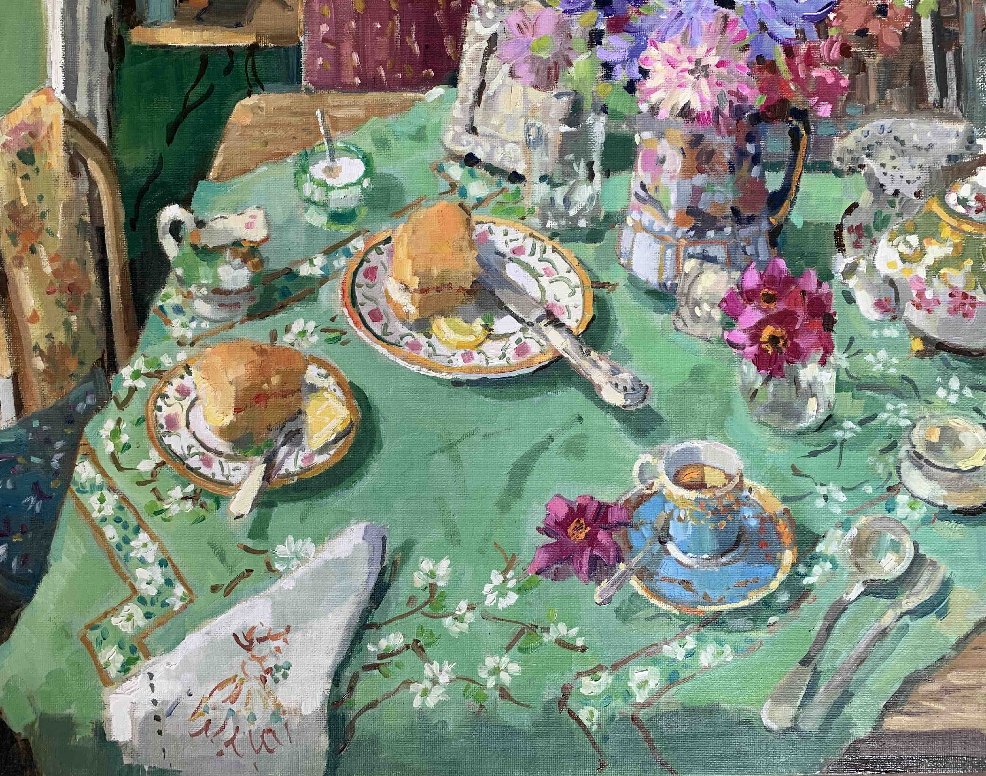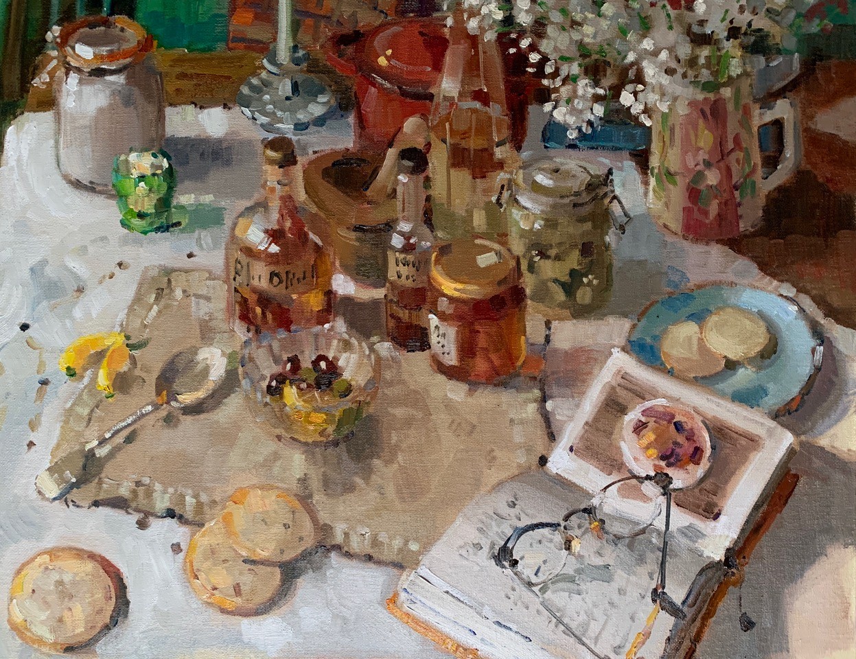 With a collection of vintage china and bottles, ‘I enjoy choreographing nostalgic scenes that tell a story and allow the viewer to escape to a colourful world of flowers and edibles drenched in bright sunlight.’ The interplay of light reflecting from a nearby jug or the warmth of a shadow cast by a flower adds depth and intricacy to her work.