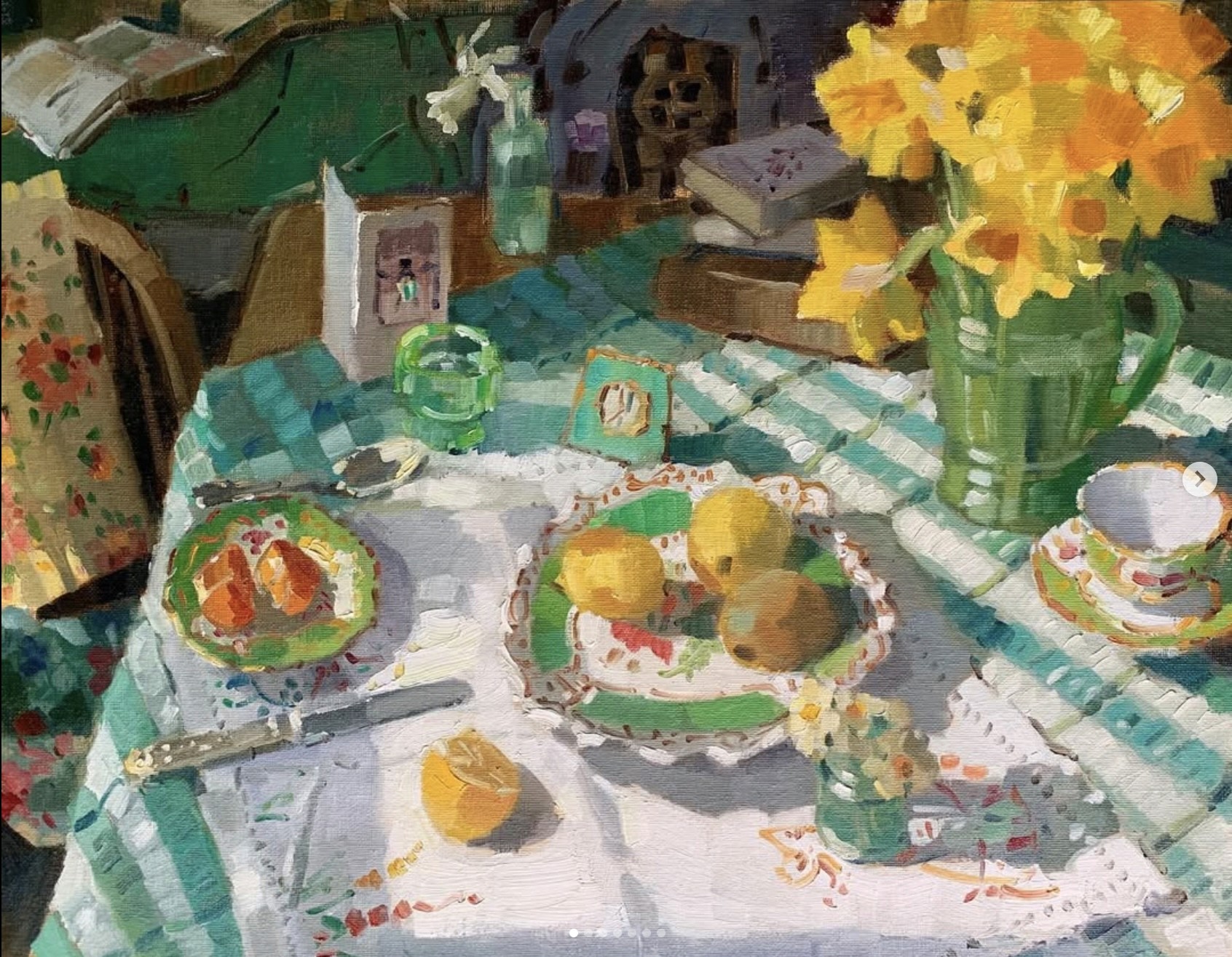 Coming from a family of artists, Lizzie’s training is both formal and personal—she learned foundational techniques from her father, the noted artist Bernard Evans. This blend of tradition and innovation is evident in her practice, which balances classical methods with her own unique voice. Lizzie’s influences include the Impressionist masters Vuillard and Sickert, whose focus on domestic life and evocative interiors inform her own vibrant and intimate paintings.